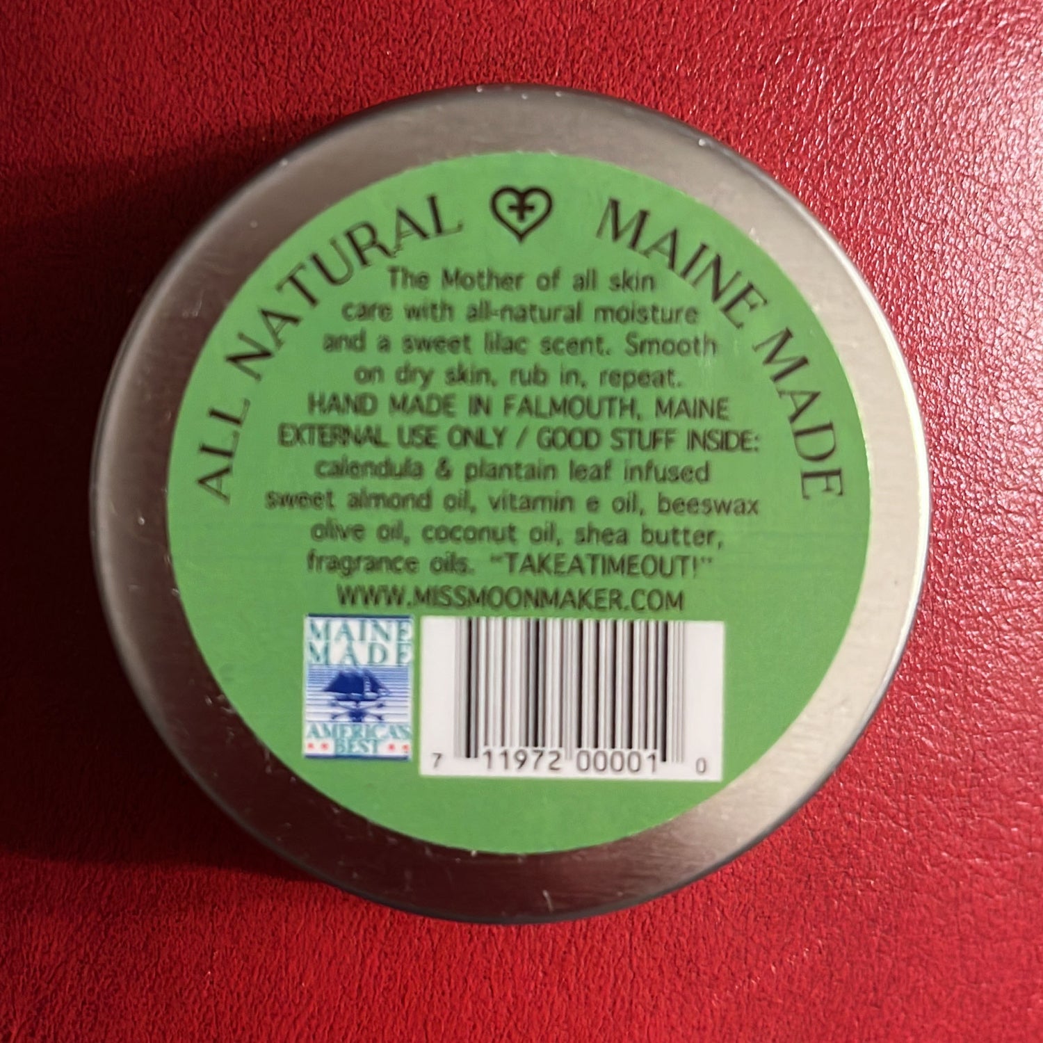 Good Stuff Inside: sweet almond oil, coconut oil and olive oil infused with calendula flowers and plantain leaf, vitamin e oil, shea butter, beeswax, fragrance oil of lilac.